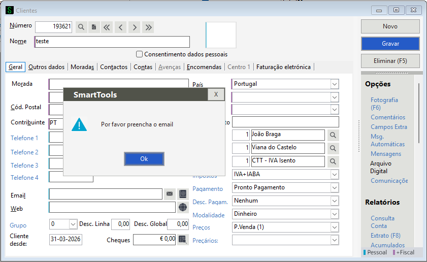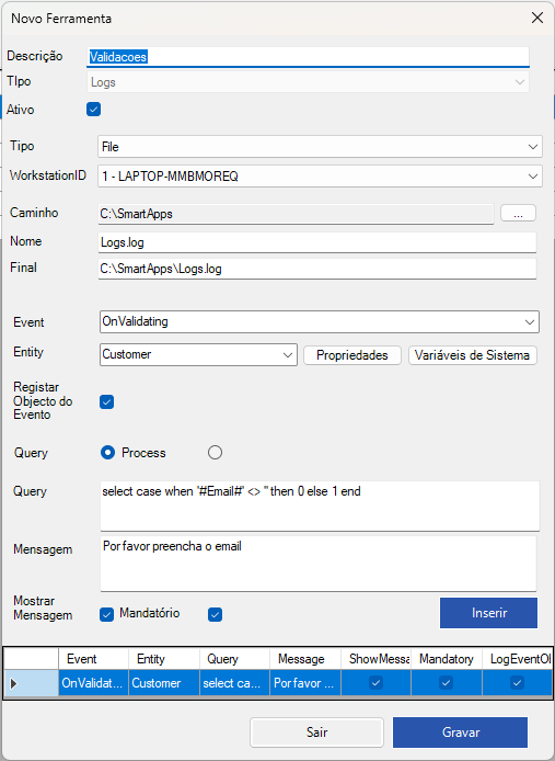 Neste exemplo acima a ferramenta criada vai verificar ao gravar um cliente se o email está preenchido, caso nao esteja aparece a mensagem “Por favor preencha o email” e nao deixa gravar o cliente até o mesmo estar preenchido